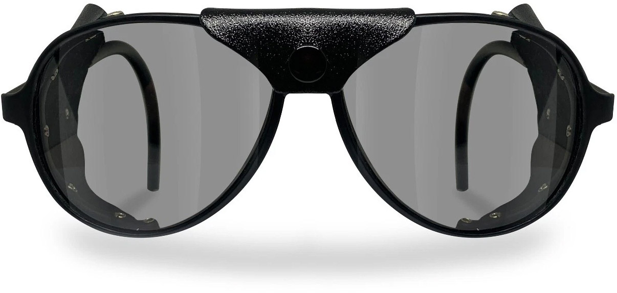 The glacier sunglasses worn by Kurt Russell have a black matte-metal frame, aviator frame, black leather side shields with metal studs, and a removable black leather nose-bridge cover.
