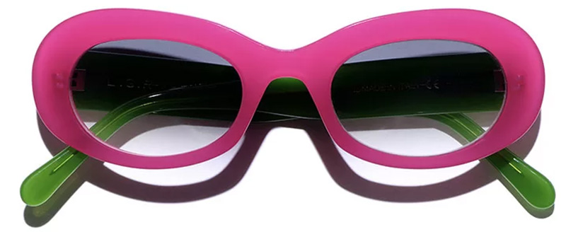 The L.G.R glasses have a Bubble Gum Pink / Lime Green frame and Grey Gradient lenses.