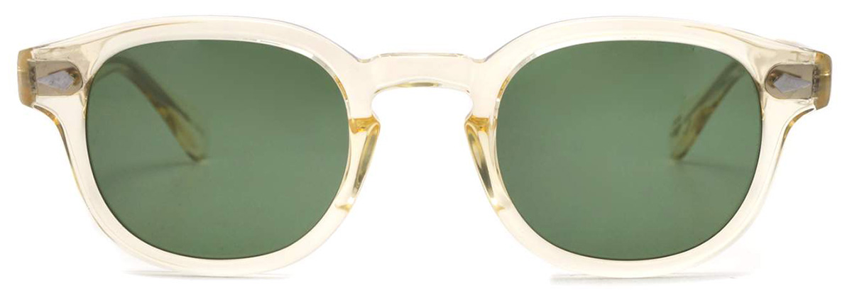 The Moscot glasses have a clear frame and triangle rivets on the front and sides of the frame.