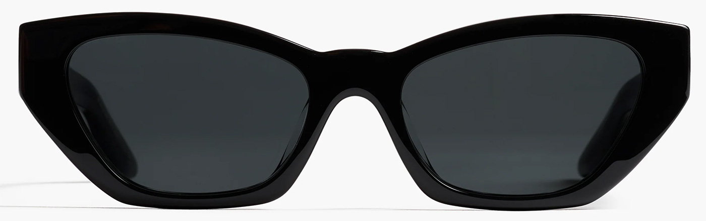 The sunglasses have a black cat-eye frame with gold lines on the temples.