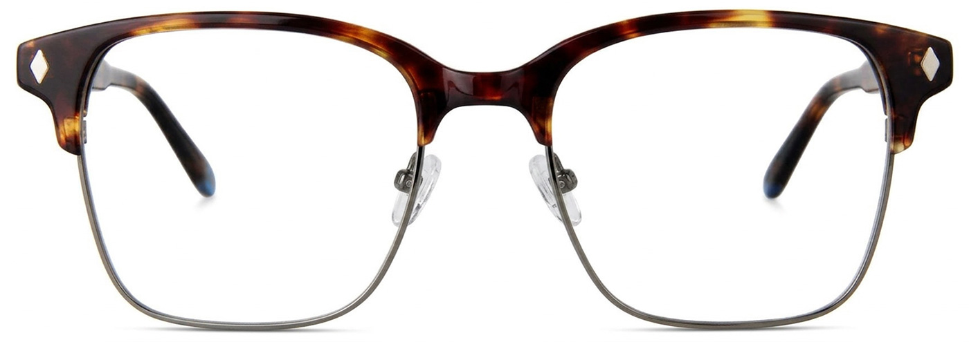 The eyeglasses have a metal and tortoise frame.