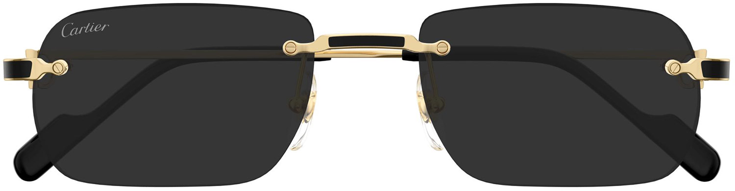 These Cartier gold sunglasses have a gold frame with a bold hinge. The lenses have a rectangular shape in a rimless construction. The temple tips feature a Cartier logo plaque.