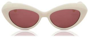 The white sunglasses have an oval cat-eye frame and angular white arms and a logo on the temples. We don't have confirmation yet, but are fairly sure that the sunglasses worn by Sarita Choudhury are Lanvin LNV648S.