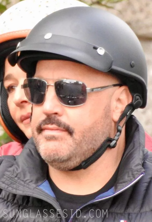 In a behind-the-scenes photo of Kevin James riding a scooter we ca nspot metal aviator sunglasses with what looks like the Panama Jack logo on the temples, and black temple tips.