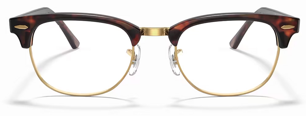 This is not yet confirmed, but the glasses have the classic Clubmaster browline design, dark tortoise color and gold metal hardware and rivets on the front and sides.